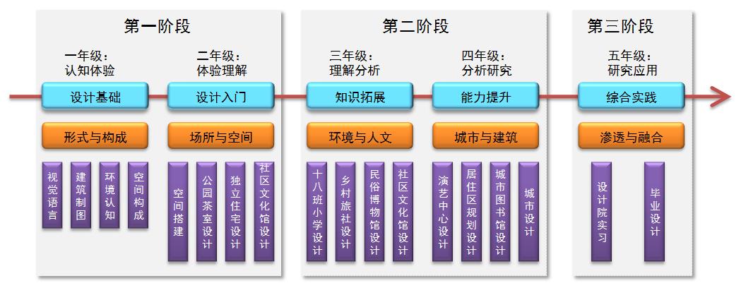 我们以核心设计课程作为改革抓手,将其设定为“主轴”,打通其与其他门类课程联系,实现相互支撑、形成“关联结构”,重构课程体系(如图2)。如在“设计基础”系列中,植入游走体验、装置设计等其他门类设计课题,同时围绕设计课辅以多条并行课程板块作为支撑,如设计原理、美学理论、建筑历史与实践环节等。通过结构化调整,能够使学生进一步树立起“广义设计观”,提升设计综合素养,形成面向复杂问题的思辨能力(如图3)。